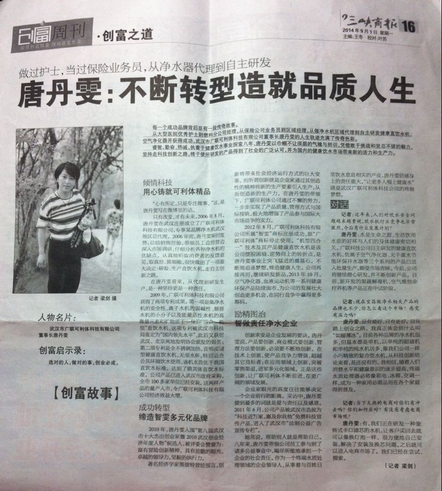 从大型医院优秀护士到燃料分公司经理,从保险公司业务员到区域经理,从做净水机区域代理到自主研发健康直饮水机、空气净化器并获得成功,武汉市广联可利体科技有限公司董事长唐丹雯的人生轨迹充满了传奇色彩。
